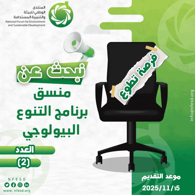 أعلنت National Forum for Environment and Sustainable Development (NFESD) عن فتح باب التقديم لدى اثنين من المتطوعين لدعم برنامج التنوع الحيوي الخاص بها. وتشمل المهام المساهمة في حماية الأنظمة البيئية، والمشاركة في البحث العلمي، والتوعية المجتمعية، ودعم السياسات البيئية. تنفّذ الفرصة بالكامل عن بُعد، ما يعني إمكانية المشاركة من أيّ مكان.